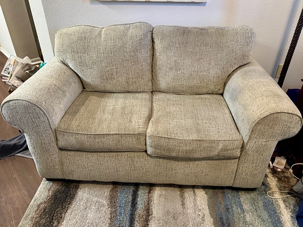 Comfortable beige loveseat. Located in Alden Bridge. Bring help to load.