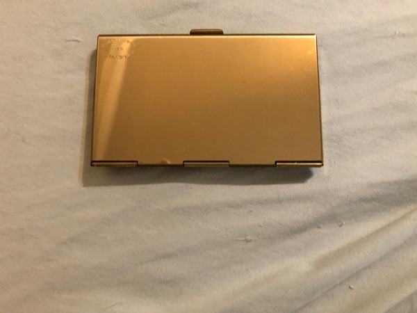 Made in the USA. Has wood top and solid brass case. Perfect for business cards or credit cards. Small scratch on the bottom. Asking $5.00.