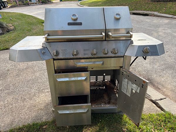 Stainless Steel barbeque grill. The grate is in good shape. The heat shields are OK but need replacing. One of the burners works but needs to be replaced. The grill is sitting at the end of my driveway. If you want it, please respond to this listing and I will give you the address.