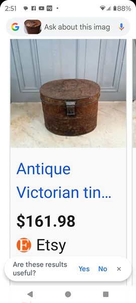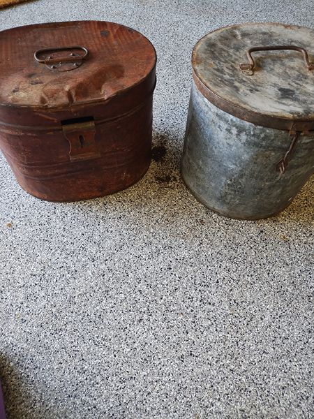 One is an antique traveling hat box and not sure what the other one is called...just know they are old and sell for a lot more than I am asking ..$75 and they are both yours....the gavalzined one does has a few small holes on the bottom....the second photo shows the exact same item as mine for $160 dollars ..you will be buying 2 for $75....less than $40 dollars each...my price is Firm.....