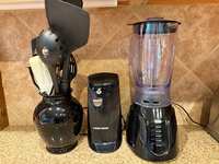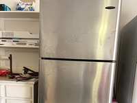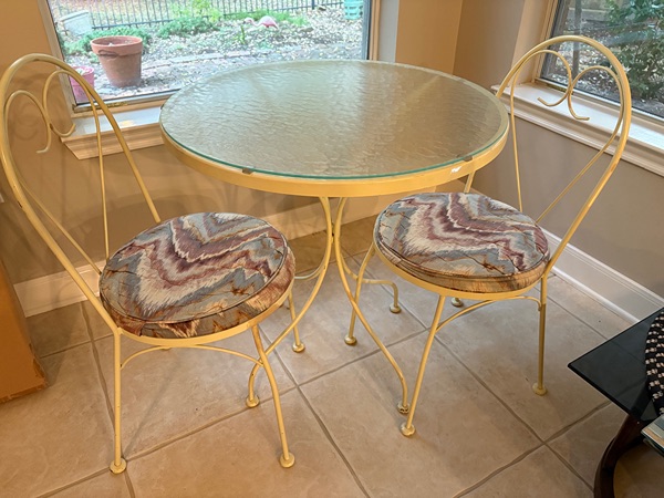 Vintage metal glass top cafe table 28" diameter with 2 cushioned chairs.