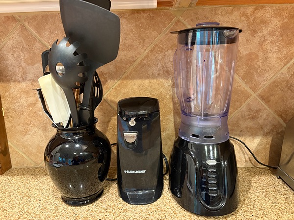 Black&Decker can opener, blender and miscellaneous kitchen utensils (spatulas, etc)