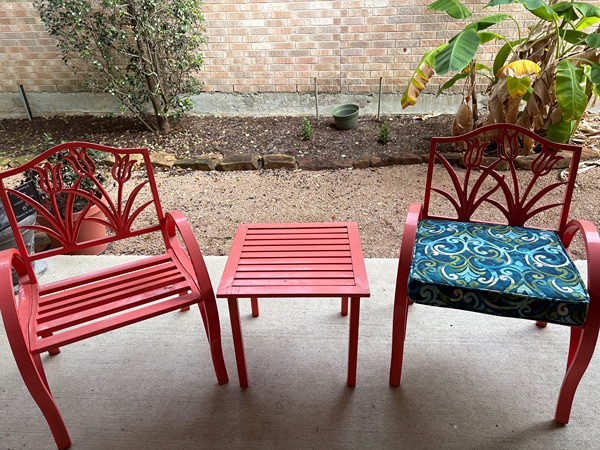 Two Wrought Iron Patio Chairs with Side Table