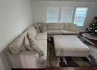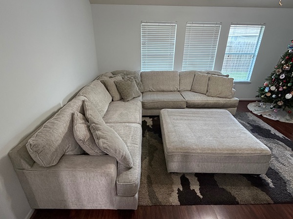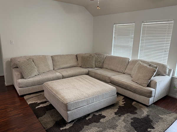 Spacious and comfortable 3-piece sectional couch (grey/beige) with matching ottoman for sale. Both sides of the sectional measure 129” long, offering generous seating for family and guests. Overall sectional dimensions are 129” x 44” x 31” high. The oversized ottoman measures 50.5” x 50.5” x 17” and is perfect for lounging or as a coffee table alternative. Throw pillows included. From a clean, smoke-free home. Great option for a large living room or open-concept space. Used but like new, very good condition
