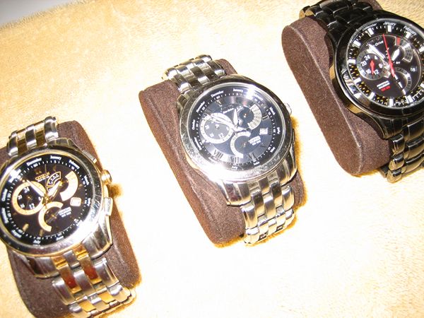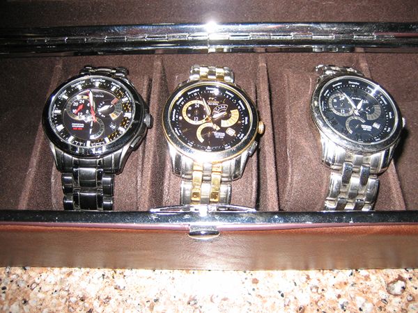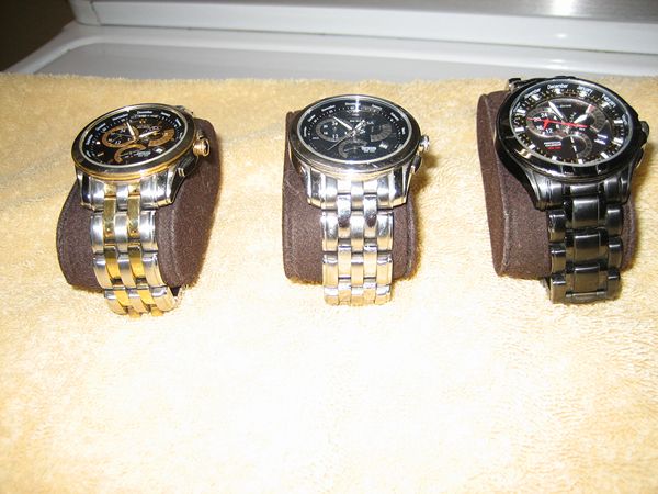 Selling three Citizen Eco-Drive watches. One has chrome band, another chrome with gold color and the third is black band. All of these have been checked out by a jeweler and are running with no problems.....just no longer worn.