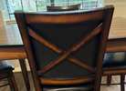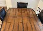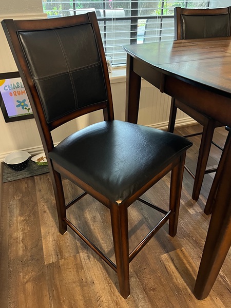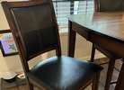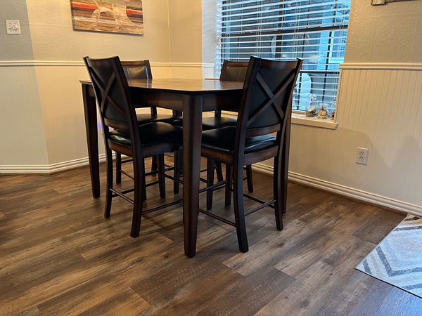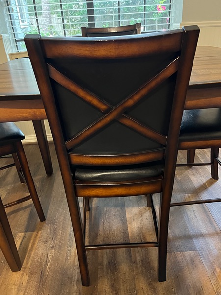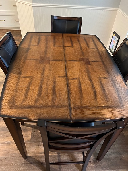 39.5"W x 53"L x 36"H table, 4 barstools, and 13.5" leaf. Used but in fair condition. 1 barstool has a worn corner of the cushion.