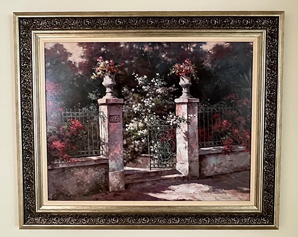 Large elegant framed painting of a garden scene with ornate border. Approx. 34” x 28”…$25 firm