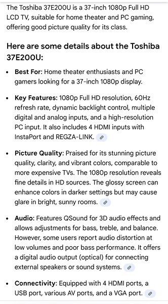 Toshiba 37" TV with remote. Works great. Not a smart tv. We used it with a Roku device. $25 located in Panther creek near gosling and lake woodlands