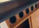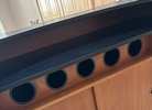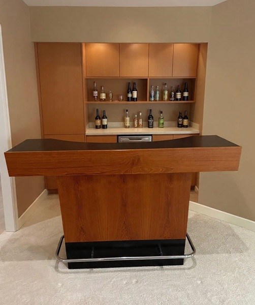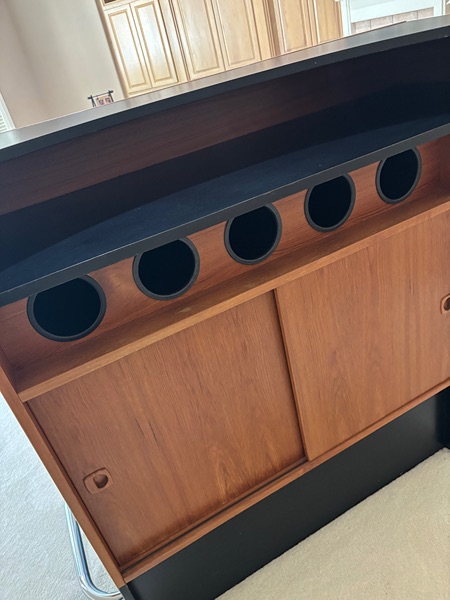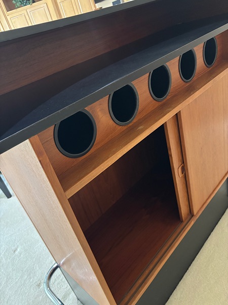 Exceptional free standing Danish teak bar. This outstanding dry bar resembles Erik Buch’s popular design. This vintage 1960s bar features an ample countertop surface. The easy to maintain black laminate table-top contrasts beautifully against the rich patina of the decades old teak wood. Note how the bottom of the cabinet features the same black surface as the counter top. The bar includes several circular portals for storing liquor or wine bottles. A spacious cabinet allows one to store glassware, mixes, and all your bar necessities. The backside of the counter features a lower shelf. This allows the bartender to neatly prepare drinks without interfering with guests.