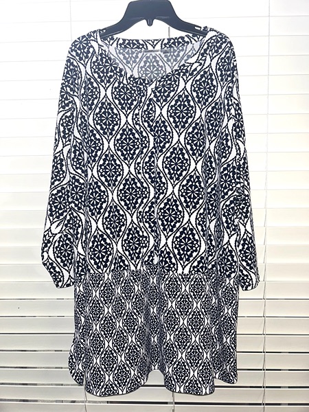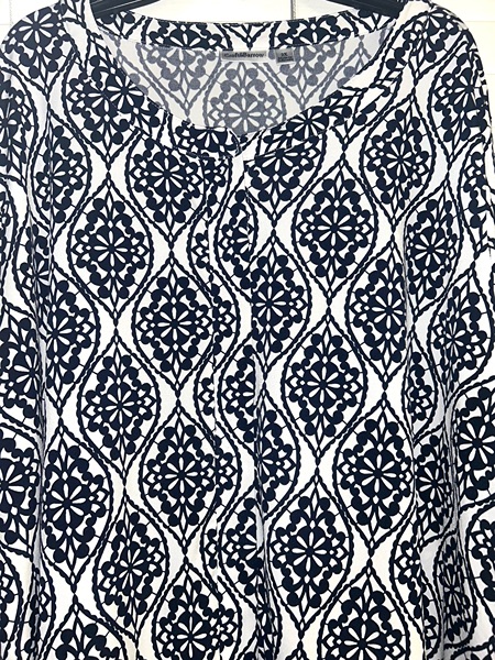 Croft & Barrow brand size 2x tunic top with allover geometric Moroccan trellis boho pattern in black & white.* Features stretchy fabric, 3/4 sleeves, and hidden half button up front panel. Has minor pilling hidden by the design pattern; otherwise very good condition from smoke free home. *I'm unable to distinguish some colors, so there's a chance this is very dark blue. Other online ads for this shirt state that it is black. $5