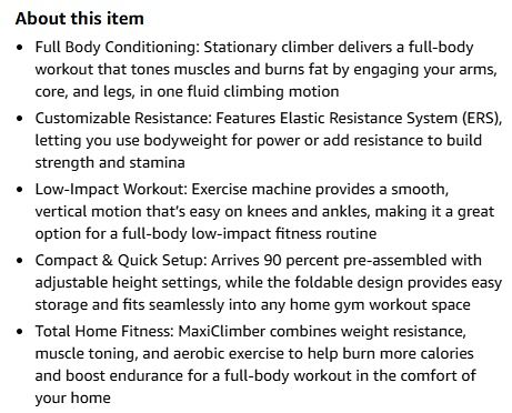 Full body Conditioning: Stationary climber delivers full-body workout that tones muscles and burns fat by engazing arms, core, and legs, in one fluid climing motion. Amazon Price: $179.00. Price includes extra rollers and floor mats.
