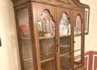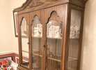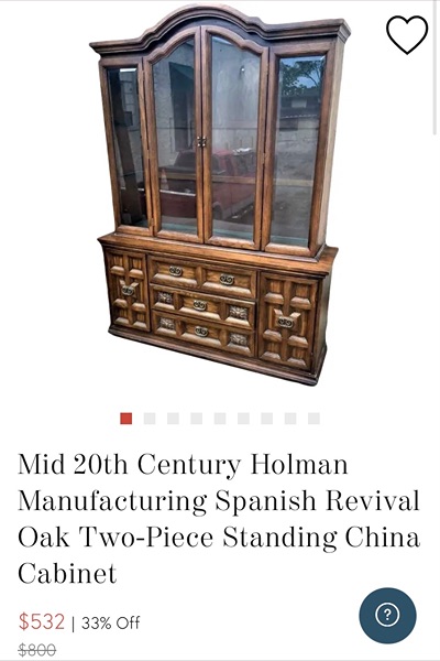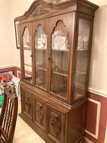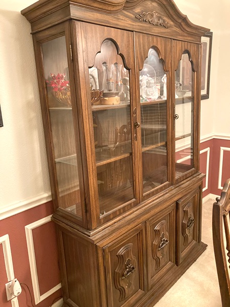 The hutch is 52 inches long, 80 inches tall, 17 inches wide. Three glass shelves on top, with utensil drawers and cabinets on bottom. Glass shelves in perfect condition, no cracks. Plastic seal around side windows has some cracks. Light fixture in hutch is not working. The hutch is similar to the one pictured on sale for $532.