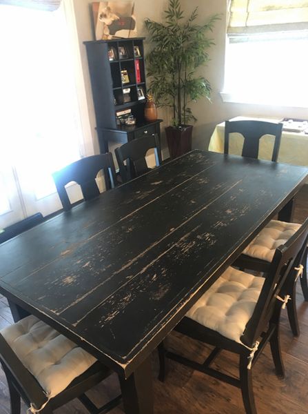 Beautiful Pottery Barn black distressed dining table with two removable leaves.