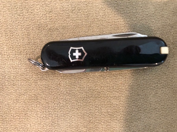 Black leather key ring with pouch for a small knife or other small item. Knife is included in purchase. Very good condition. Asking $2.00.