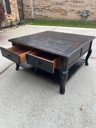 Nice black/brown square solid wood coffee table. 20”h x 38” wide. Drawers on both sides.