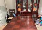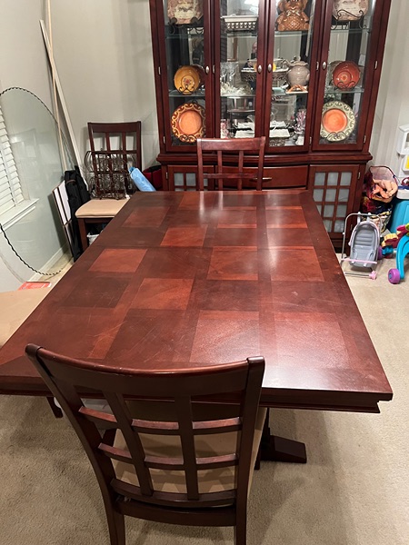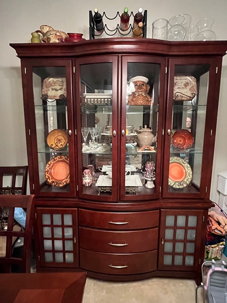7-piece dinette set w/ 2-piece hutch. Great shape interior lights work well. Glass is clean in hutch. Table and chairs are in great shape. Contents in the hutch are not included.