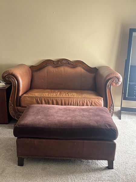 This is a leather loveseat and ottoman for free. It has been in our primary room and was rarely used. It comes from a home of non-smokers, and pets were never allowed on it.