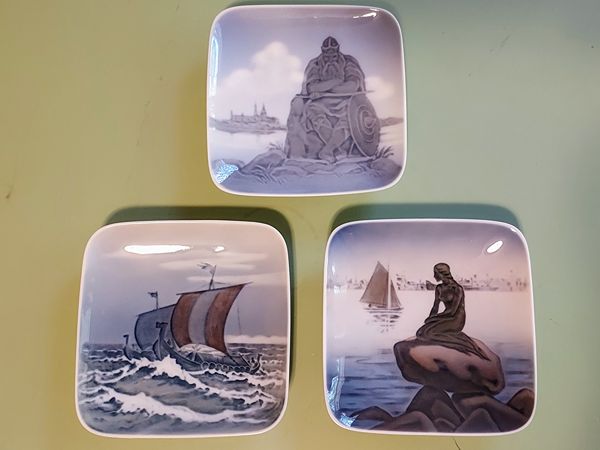 This set of three Royal Copenhagen trinket dishes is inspired by a Nordic theme. Each dish is stamped and numbered. The collection features "Helsingor," "Vikingeskibe," and "Langelinie" and are beautifully glazed. Each dish measures 4" x 4". They are in excellent condition with no cracks, chips and/or crazing. Reduced price is $20 - cash only. If interested, please text or call and thank you.