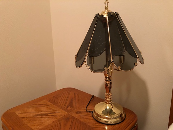 Three way touch on lamp with brass base. 25 inches tall. Pretty designs on shade panels. Very good condition. Asking $10.00.