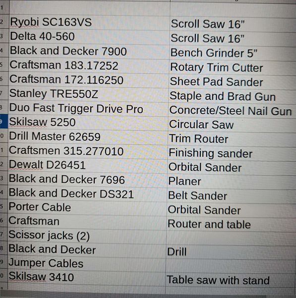 Variety of tools for sale (two listings). Husband passed away and I am having to clear out some items, so I don't really know much about them. They have been plugged in, so I know they turn on. He had been using them, so to my knowledge they function properly. You are welcome to come by and check them out before purchase. There is a picture of each, with the asking price, and there is also a picture of the list that has the model for most. I will sell separately or as a lot. Price may be negotiable, but please don't lowball, as I need the funds to pay bills. Thanks in advance.