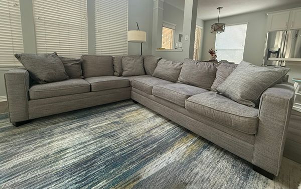 Grey fabric L-shaped sectional sofa in good overall condition. Originally purchased for $2,000 and gently used in a smoke-free home. Comes with three pillows in new/unused condition.