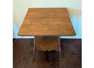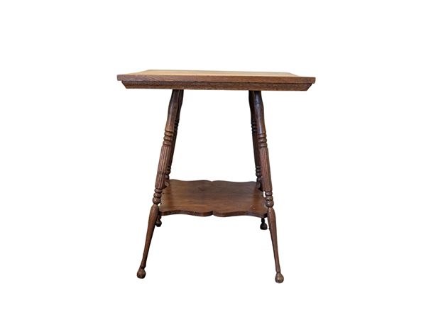 Antique oak parlor table has pretty grain and patina. Solid wood two-tiered side table has some joint movement when the table is moved, which is consistent with a piece of this age. Otherwise, it is in good condition with no major damage or scratches. Priced with condition in mind.