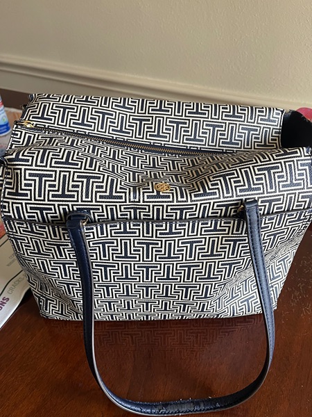 Iconic Tory Burch blue and white tote handbag. Handles used tote is in great condition. 9" tall 15" wide 6" deep. 55.00
