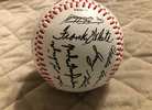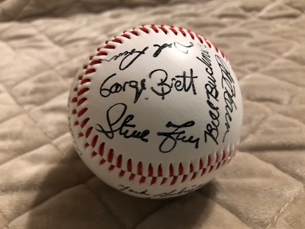 Regulation size baseball. Autographs are stamped on the ball. Autographs include George Brett, Frank White, Willie Wilson and Brett Saberhagen. Has plastic protective case. Asking $7.00.