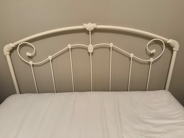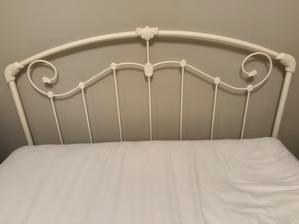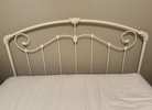 Beautiful white queen size wrought iron headboard and mattress with box spring. Barely used for guest bedroom.