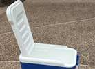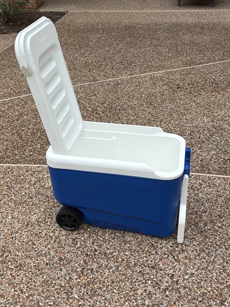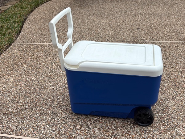38-Qt Igloo Cooler with wheels and pull handle. Like new. Ideal for keeping food and drinks cool at backyard gatherings, camping and soccer games!