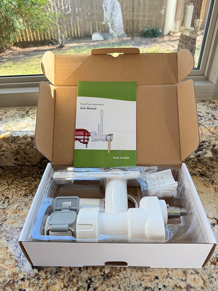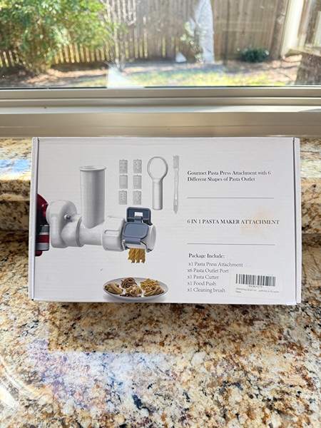 Pasta Maker Attachment: $15 Gourmet Pasta Press with 6 different shapes of pasta - Fusilli, Spaghetti, Bucatini, Rigatoni, Large Macaroni & Small Macaroni. Attaches to Kitchenaid mixers.