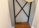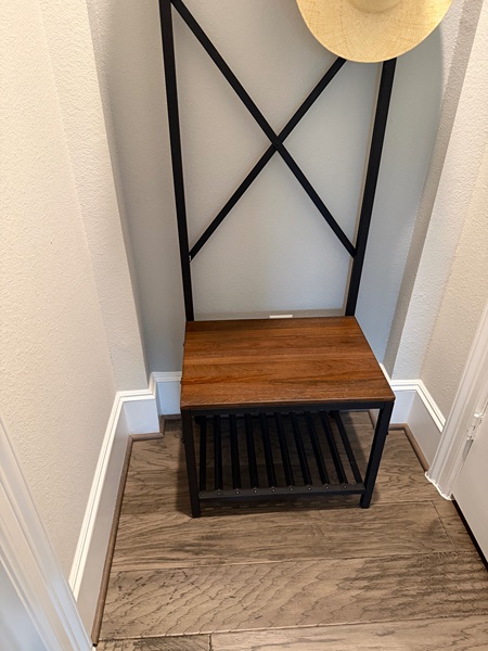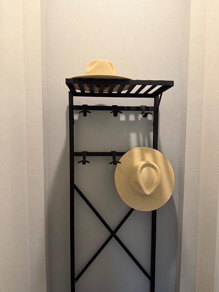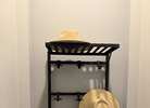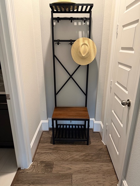 Coat/Hat rack. In excellent condition. Black wrought iron, with wood seat. Hats not included.