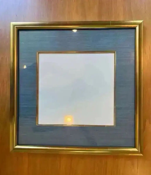 19 x 19 square with blue fabric matting and gold frame. The interior portion where the artwork will fit is 11” w, 10 1/2” l…$15 firm