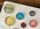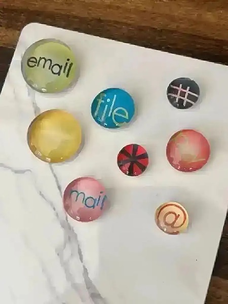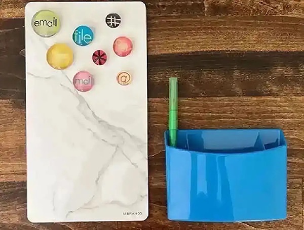 Marble design magnetic whiteboard with colorful magnets and blue pen holder.