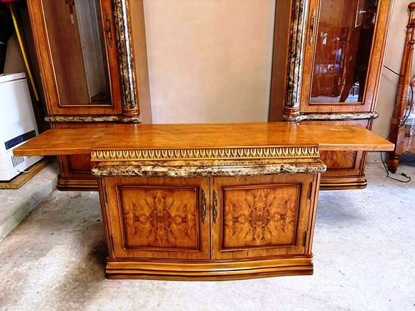 Stunning & Elegant Special edition Entertainment center crafted in carved wood with marble‑style columns and glass cabinets with light .A striking piece that elevates any living room with style and distinction. 2 lateral glass curio cabinets. Approximate dimensions Height 87" Wide 105" (Expandable with the extensions included) Deep 24". The side cabinets are joined by a screwed shelf. Free of smoke or pet 🐶 odor.
