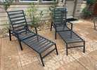 🌴Pair of steel lounge chairs with 5-position adjustable backrests, in black. Briefly used, weight 31 Lbs. each. Approximate dimensions: 76.75” long, 21” wide (25” including armrests), 12.5” to 20.75” high. NO rust or dents. Compare quality, price for both. 👌