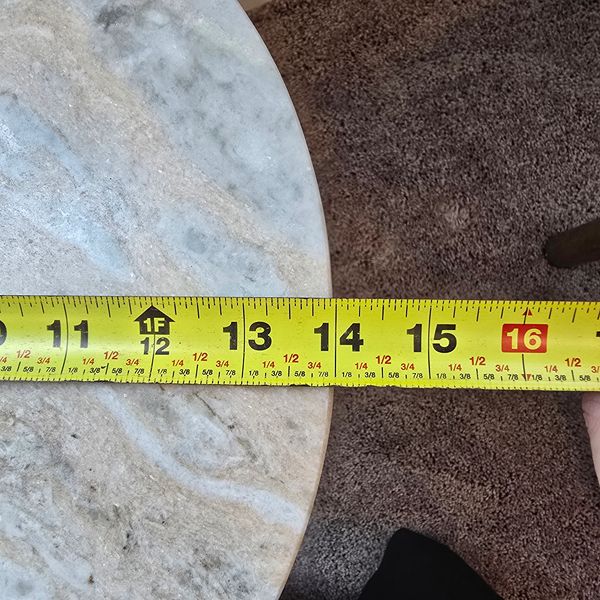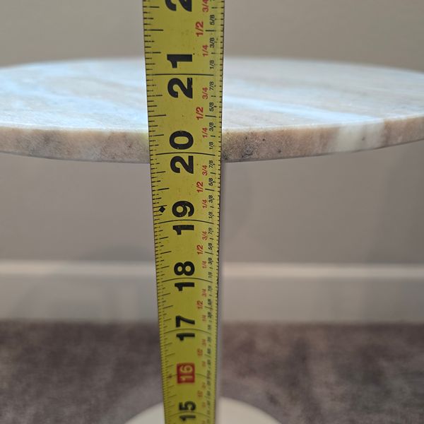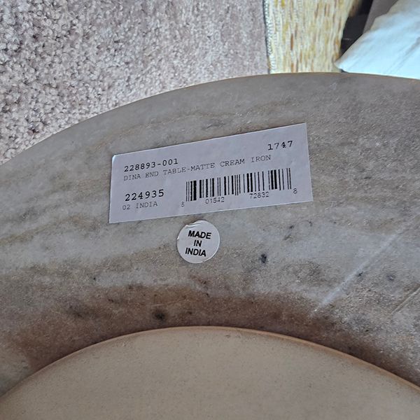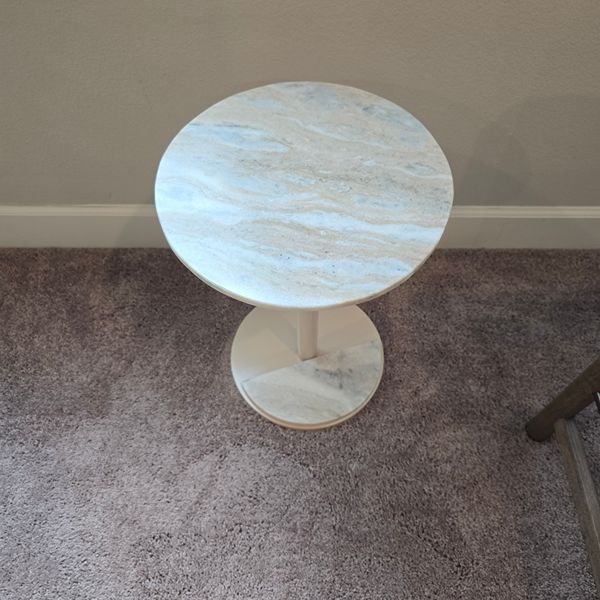 Four Hands Marlow Dina End Table in Matte Cream Iron finish. Polished white marble top (veined pattern) and a matching tapered pedestal base in cream iron. Located in The Woodlands 77381. Crossroad kuykendahl road and research forest drive.