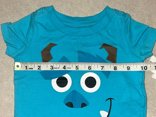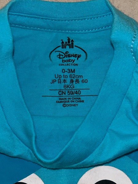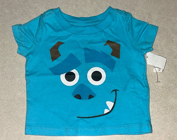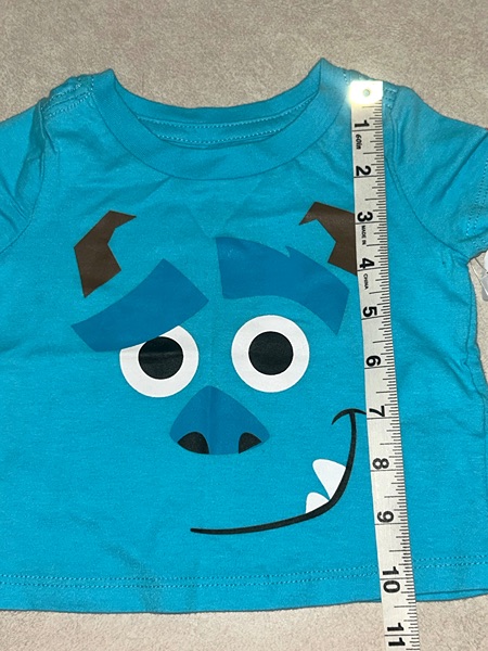 Disney Baby t-shirt featuring Sulley from Monsters, Inc. Blue short sleeve shirt for baby boys size 0-3 months. Has a tiny mark that looks to be from a tag or tag gun near left pit (pictured just above the 9.5 inch mark of the measuring tape above the chest). New with tags from smoke free home. $8