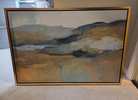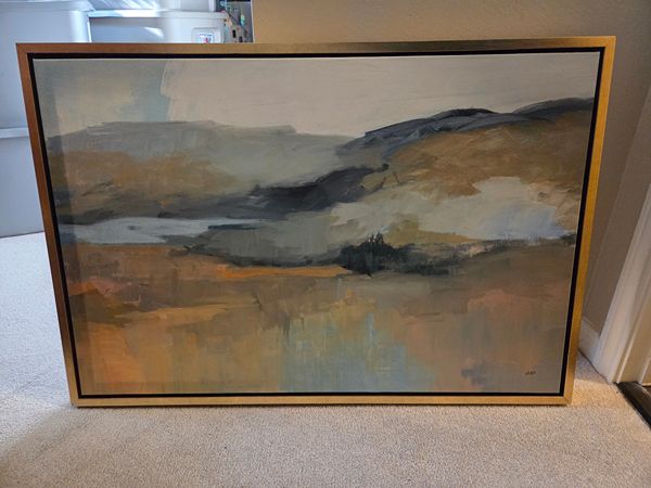 26 in. x 38 in. Purchased from Gallery Furniture for $450 Uttermost Brand The Folded Hills Framed Canvas Displays An Abstract Landscape In Cool Sky Blue And Honey Yellow. A Solid Wood Gallery Frame With Gold Finish Completes The Artwork. Each Canvas Is Proudly Handcrafted And Printed In The USA. Artwork By Julia Purinton.