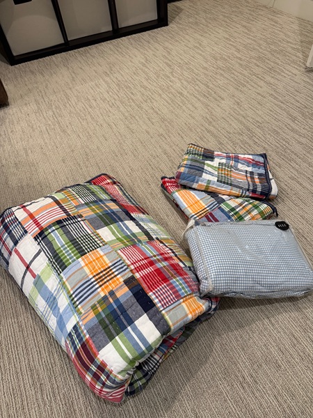 Gently used Pottery Barn Full size Madres Quilted Comforter along with two matching shams and full size gingham sheets.