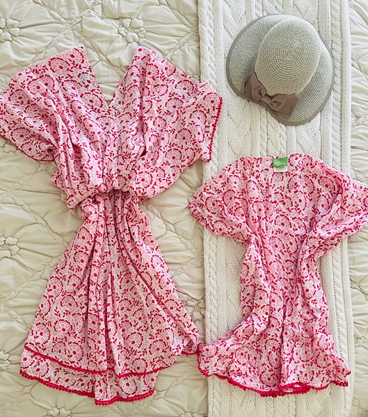 Mommy and me matching swim cover ups by Classic Whimsy. The mother’s dress is a size small/medium and the daughter’s is a size 10/12. They’re both very flowy and you could use a sash with them if you chose to. I’m also including a brand new sun hat that has never been worn. The cover ups were only worn once for photos. $20 for all, porch pickup in The Woodlands.