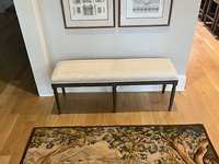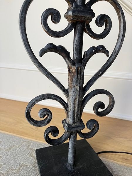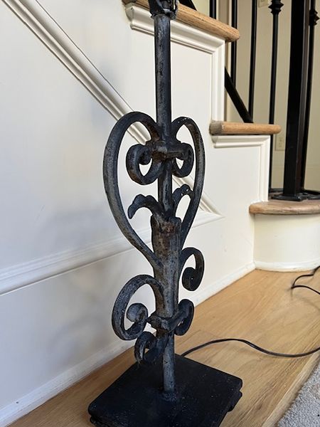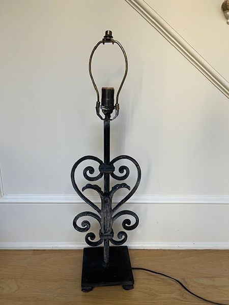 Heavy wrought iron lamp. Handmade and purchased at Round Top. Does not come with shade.