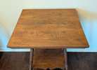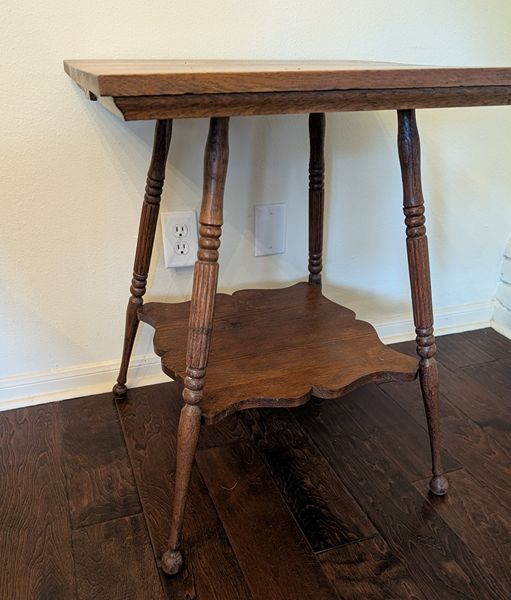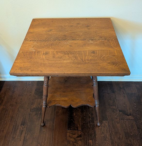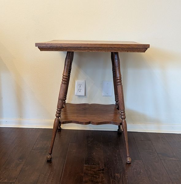 Antique oak parlor table with pretty grain and patina. Solid wood two-tiered side table has some joint movement when the table is moved, which is consistent with a piece of this age. Otherwise, it is in good condition with no major damage or scratches. Dimensions: 24' square x 28' tall $75 cash