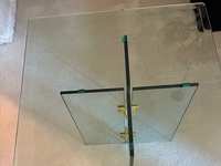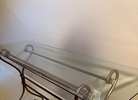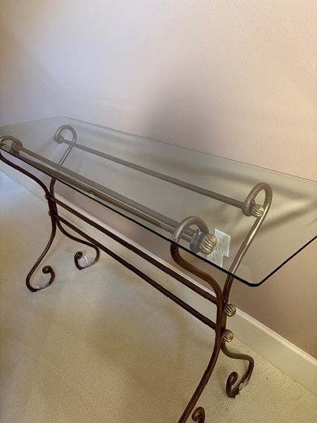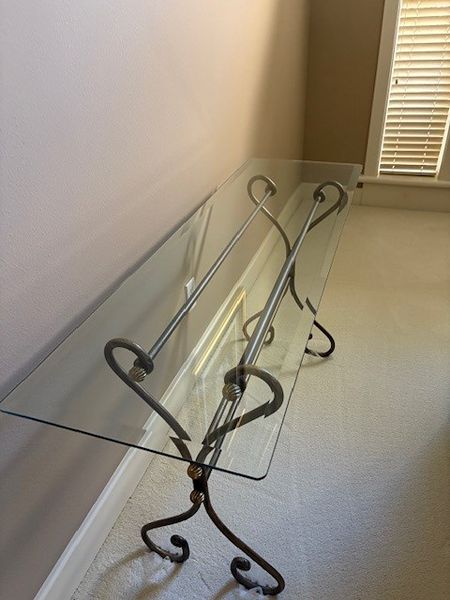 This is a scrolled iron base glass-top console or sofa table. It features a heavy iron base with a scroll design and a clear glass top. The style is often described as French Country, Tuscan Revival, or traditional Regency.