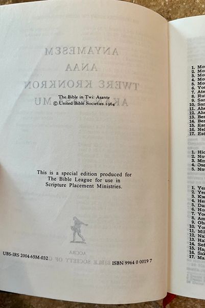 Indexed Twere Krokron Asante Bible In Twi: Santa United Bible Societies 1964.