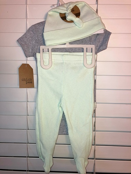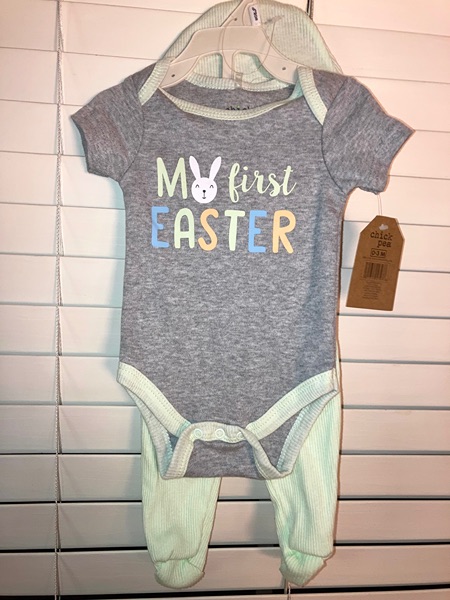 Chick Pea brand My First Easter. A 3-pc set with short sleeve onesie, footed pants, and hat. New with tags from smoke free home. 0-3 months. $15