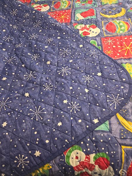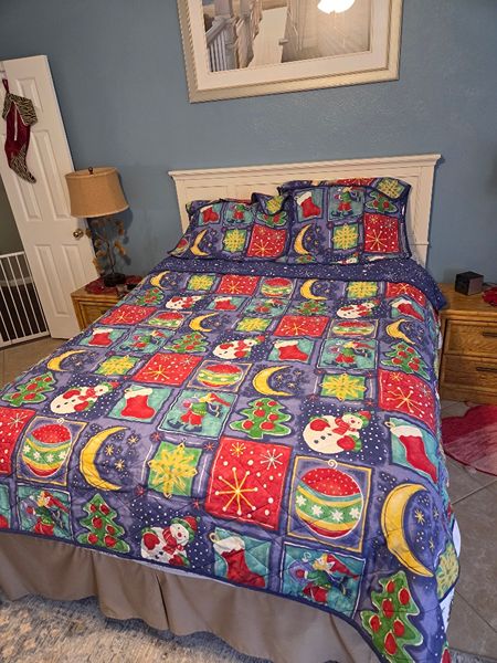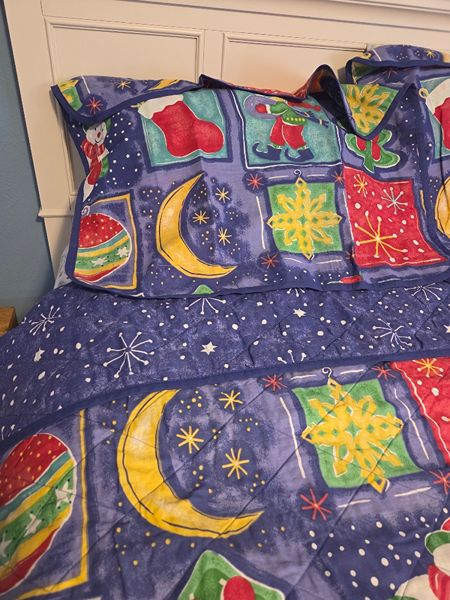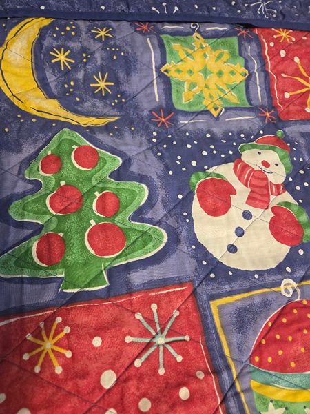 By Domestications, beautiful and fun queen size quilted and reversable Christmas blanket. Comes with 2 oversized pillow shams and a shower curtain (fabric, 2 panels with ties). The pattern has snowmen, ornaments, Christmas trees, elves with the reverse side being blue with snow flakes. Polyester / Cotton blend. RARE FIND in this pattern. EXCELLENT condition.