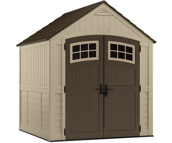 Suncast 7' x 7' Sutton Resin Shed with Floor. Extra sturdy, heavy duty resin walls. Shed comes with 2 door windows, steel reinforced construction and durable floor. Color is sand walls, mustang brown floors, slate roof and black floor. Assembles in just 2 - 4 hours.