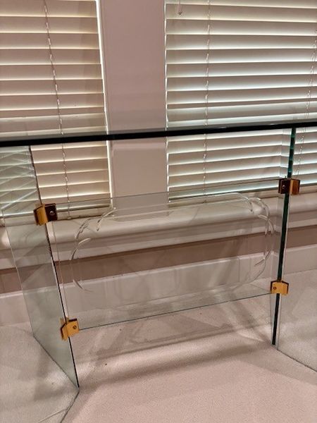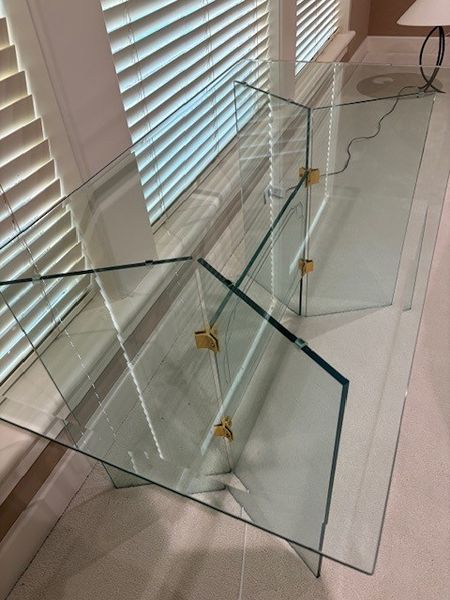 Glass console or side table, known for its distinctive design featuring thick glass panels joined by brass hardware. Could be used as a small dining table or accent table. $40 or best offer