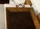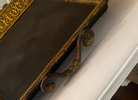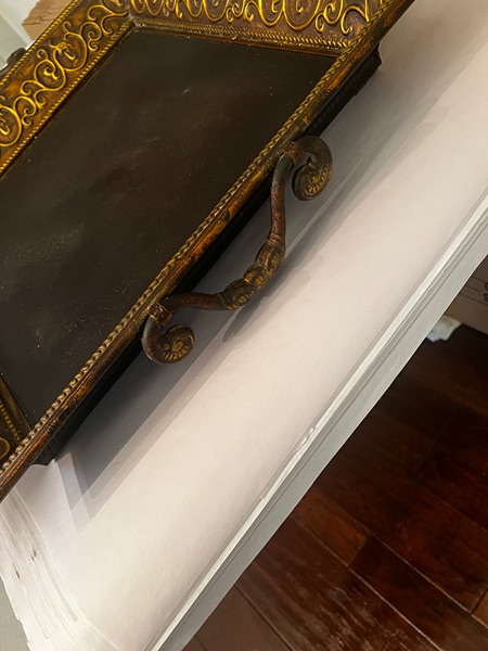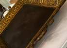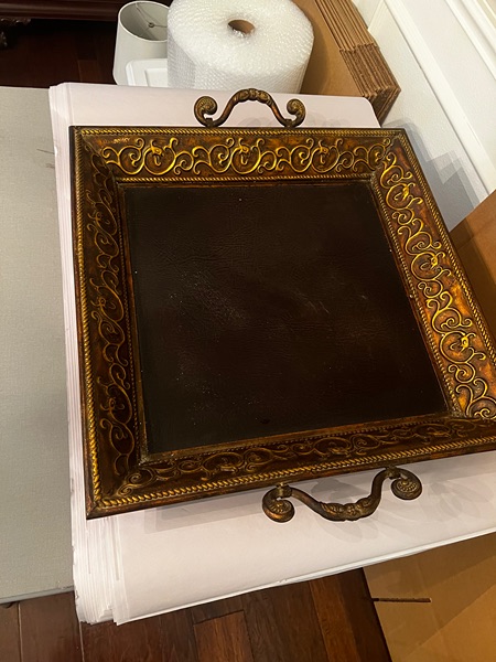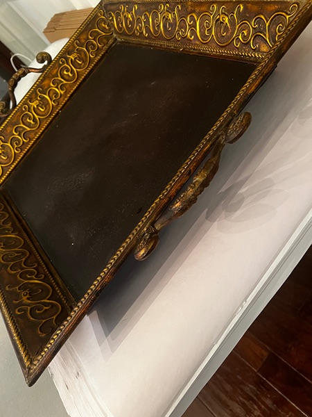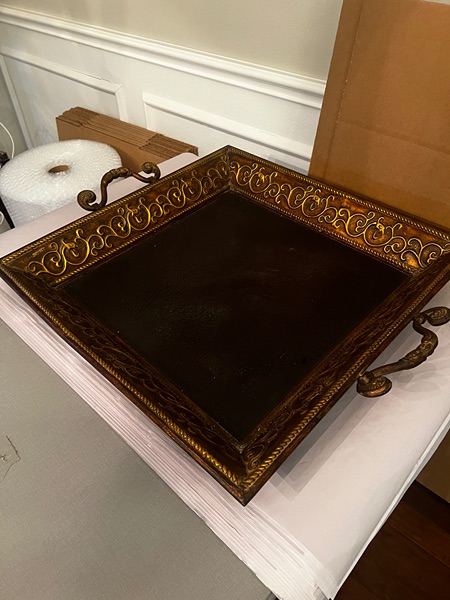 Gorgeous display tray 24" x 24". Leather like bottom. Embossed metal sides with handles. Tray measures 27" square with handles up. Creates a great display base.